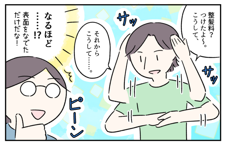 ある日、「髪型どう?」と息子が聞いてきました。見てみると、前髪は整っているものの、何だかサイドや襟足の毛がボサついています。「本当に整髪料つけた?」と聞くと、彼は「つけたよ~」と言いながら手のひらを擦り合わせ、髪を撫でるような仕草を見せてくれました。