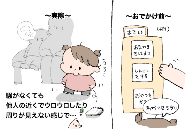 これまでさまざまなグッズや、場合によってはゲームや動画などで時間をしのごうとしてきました。しかし楽しいものを与えると今度は切り替えが難しくなってしまい……。飽きた時の対応も難しく、結果的にその場で手に負えなくなったこともあります。