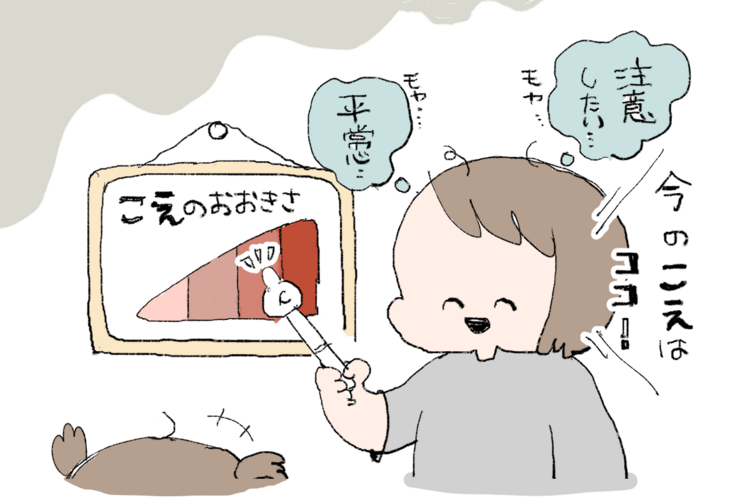 それでも一応、声の大きさを視覚的に伝えるために、イラストなどで「今の声これくらいだったね」(=マユユが出している声の大きさを伝える)と声掛けはしています。でも「この場所ではこういう声量にしよう」と理解しマユユ自身が調整するには、まだまだ時間がかかりそうだなと感じます。