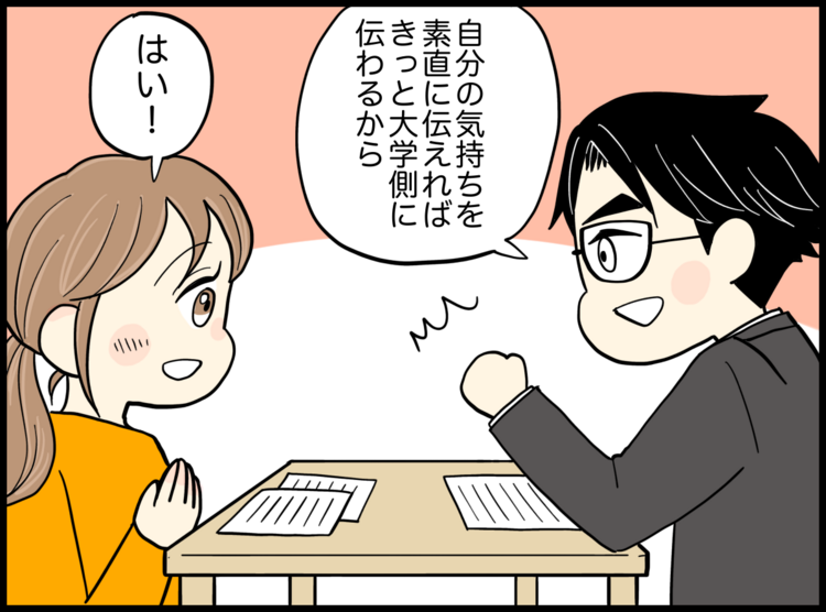 「◯◯さんなら大丈夫。自分の気持ちを素直に伝えれば、きっと大学側にも伝わるから」