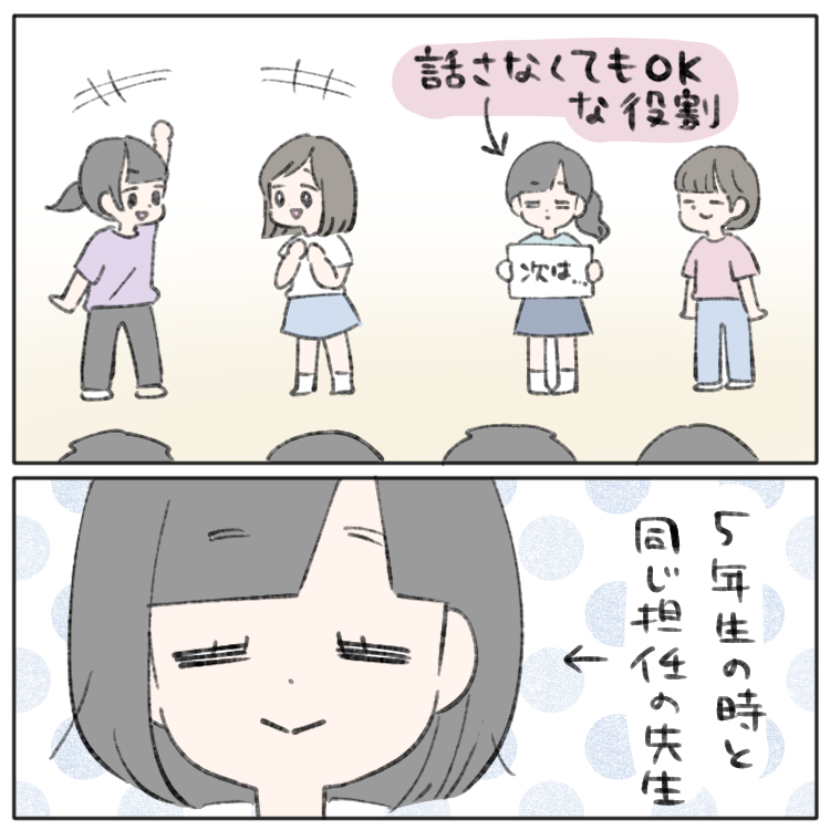 相変わらず、クラスメイトと話せたわけじゃないし、積極的にコミュニケーションを取れたわけじゃない。でも、良くも悪くも、ほとんど話せないまま6年間過ごしてきたので、次女の特性に関して周囲の子の理解があり、宿であった班ごとのレクリエーション(みんなの前でなにか披露する)では、話さなくても良い役割にしてくれました。また、担任の先生が去年と同じ先生で安心感があったことも、良かったのではないかと思います。