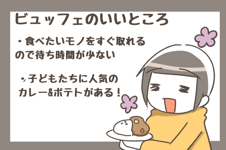 ビュッフェは、偏食気味の長男、三男にとって「食べられるものを確実に選べる安心感」に直結します。また、配膳を待つ必要がなく、自分が食べたいときにすぐ取れるので、苦手な「待機時間」を減らすことができ、パニックのリスクも軽減します。さらに「これは食べられるかな?」という新しいものへのスモールステップの挑戦も、ちょっとだけ試せるのが魅力です 。我々夫婦にとっても、子どもたちが食べ残したものだけでなく、自分たちが好きなものを食べられるのが楽しみです。