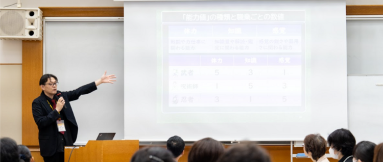 ワークショップの最後、加藤先生は「集団が苦手、コミュニケーションが苦手だという子も楽しんでくれるのがTRPG。その背景には、あくまでも仮説ですが、自分の分身であるキャラクターを介するため、大胆にチャレンジできる安心感があります。また、ルールの枠組みの中で自由な行動・想像力を発揮できるのも特徴です。ASD(自閉スペクトラム症)など発達障害のある子の中には何をしても良いよと言われると困ってしまうお子さんもいるのですが、TRPGでは役割が明確なので、分からないという不安もありません」と語られ、TRPGが持つ支援への可能性を示されていました。