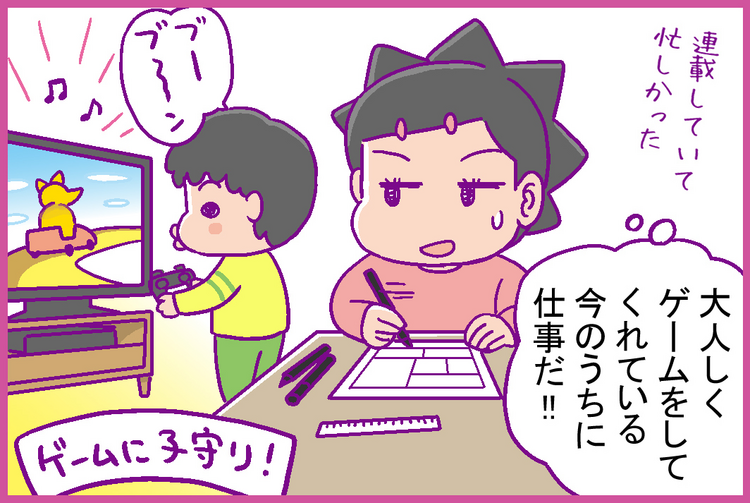 私は、ゲームが苦手で「お母さん一緒にやろうよ」と誘われてもコントローラーの操作ができなくて一緒に遊べませんでした。ですが、子育て期間中はずっと仕事が忙しく、私は家で作業をするマンガ稼業ですから、息子が仕事の邪魔をせず、大人しくテレビゲームをしてくれると助かったのです。