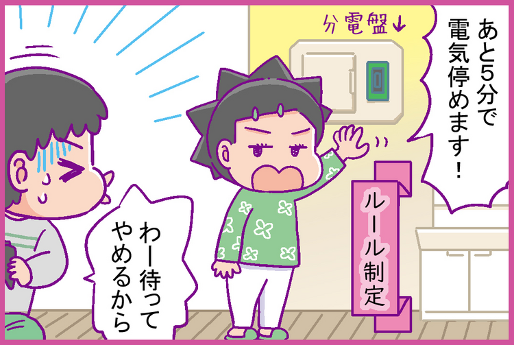 突然ブレーカーを落とすと息子が反撃して大きなケンカになったので、「あと5分で電気停めます」と警告して、ゲームを自主的に終了させるというきまりにしました。そんなルールにリュウ太は「そのルールやめてくんないかな。心臓に悪い!」と反抗して怒りをぶつけてきましたが、こうでもしないとやめられず、困っていました。