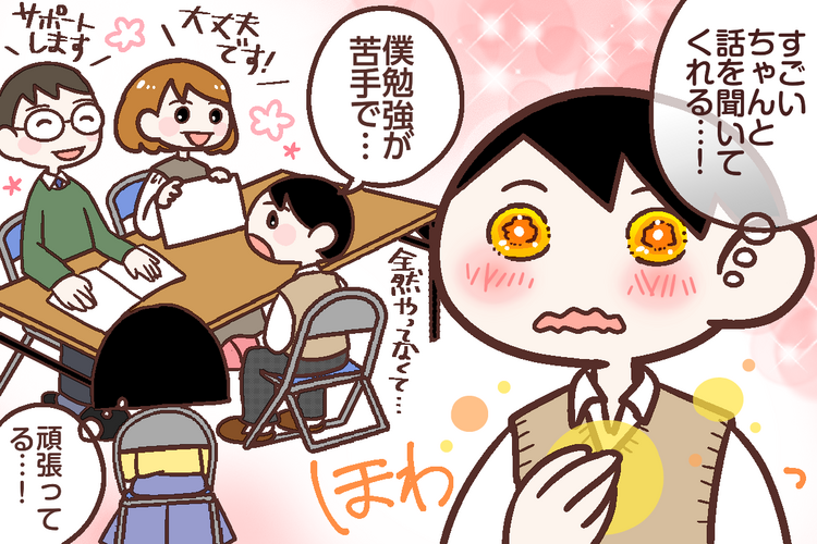合同相談会で、息子不在の際にあらかじめ状況を話しておけたのはとても幸運でした。息子にとって、難しいことやできないことを他人に話すところを本人が聞くというのは、大きなストレスです。ですので、どんな時も極力本人には聞かせないようにしています。先生方も息子自身の話をしっかり聞いてくださり、帰宅した息子は感動していました。これまで「支援が必要な子ども」として接され、話をちゃんと聞いてもらえなかったり、年齢よりも子ども扱いされることが多かった息子にとって、久しぶりに真摯に向き合ってもらえた経験でした。