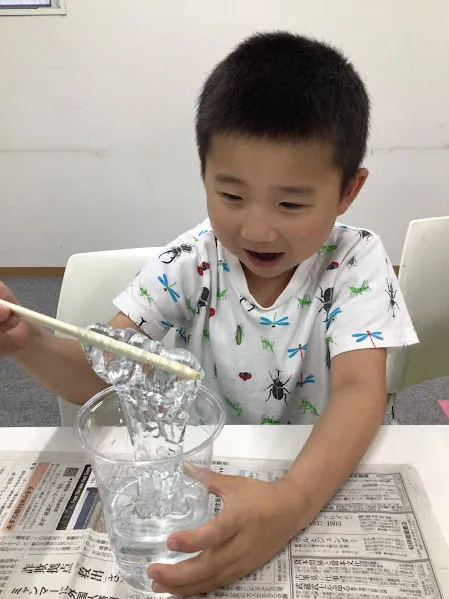 「見て、スライムからこんなに水が出たよ!」「段々固くなってきたよ。」等、