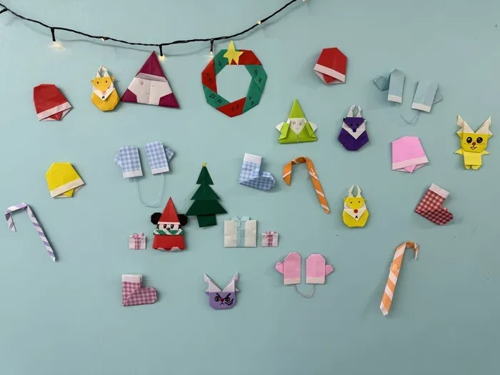 壁にはサンタさん🎅やツリー🌲、リース🎀、かわいい動物たち🐰🦊、カラフルな手袋🧤やプレゼント🎁がたくさん並んで、とってもにぎやかです♡