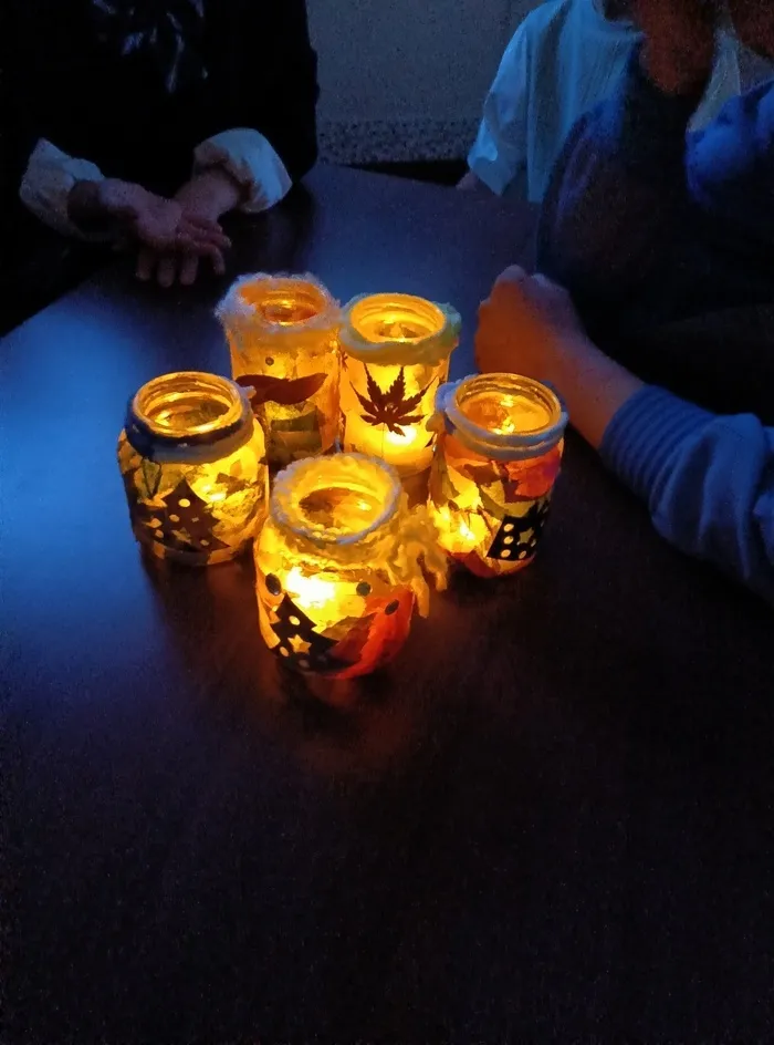 空きボトルに、色紙や落ち葉、型抜きした画用紙などを貼り、中にLEDキャンドルを入れました。ロマンティックで優しい灯りが灯りました。