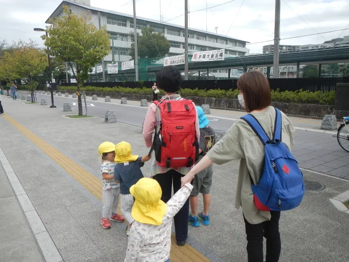 職員やお友達と手を繋いで避難場所へ歩いて行きました。