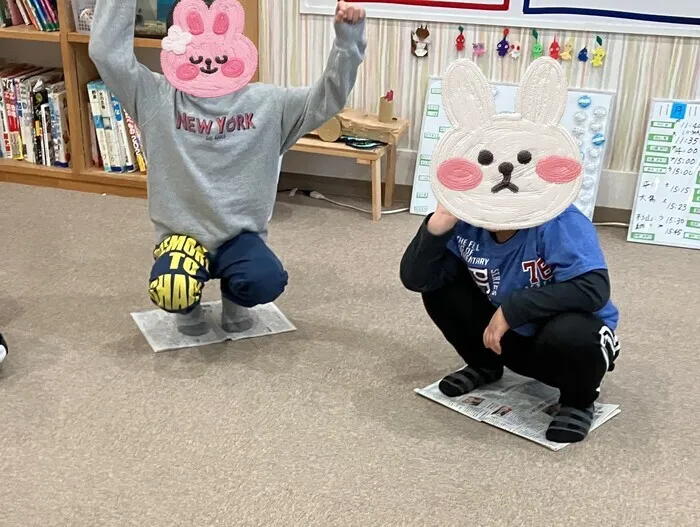 ルール理解とバランス力を目標に新聞紙じゃんけんで遊びました。