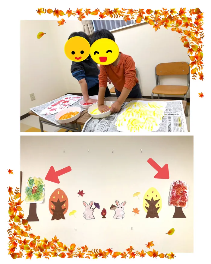 赤や黄色、オレンジなど、この時期に見られる葉の色を手につけて、画用紙にペタペタペタ。。。