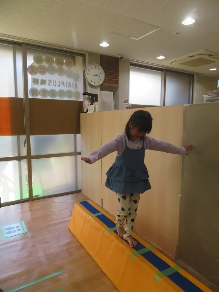 写真のお友だちは、平均台で後ろ歩きタンデム歩行をしています。