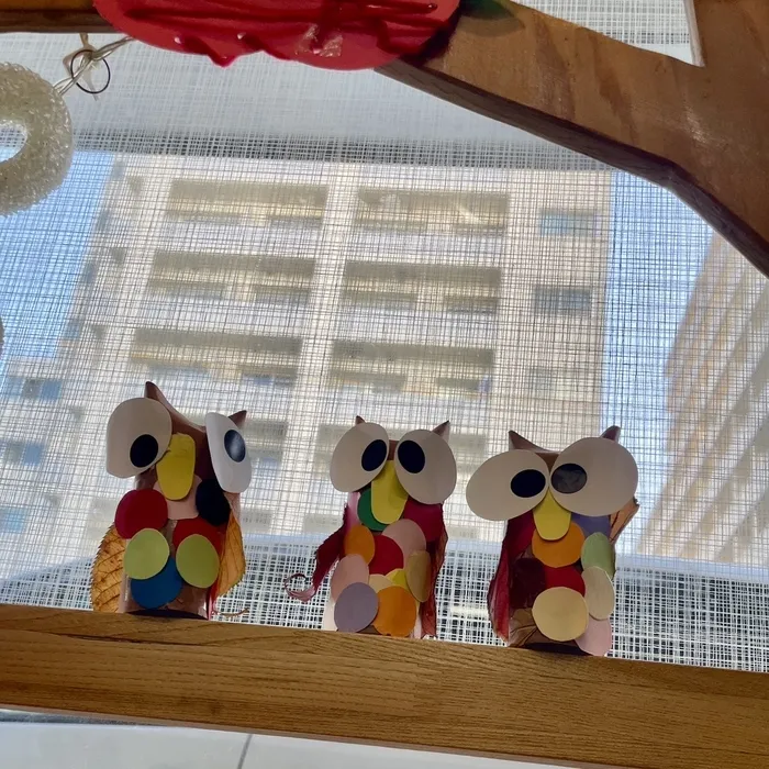 完成したふくろうを手に持ってあったの中を一緒に散歩しましたよ🌟