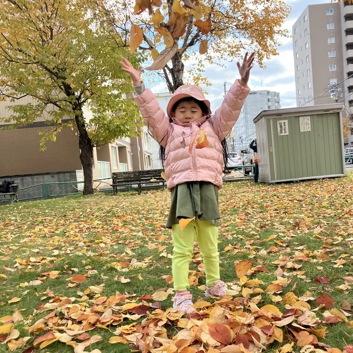 このあとお友だちも集まってきて、みんなで落ち葉シャワーしましたよ✨