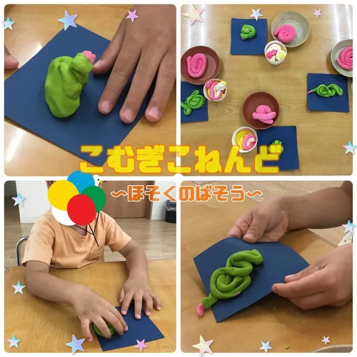 ほそながく伸ばす動作は、手の動かし方、しっかりと力をこめるといった手先の動かし方の練習になります✊細くしすぎるとちぎれてしまうので力加減の練習もできます💡見本を見て模倣する力も育まれますね👀