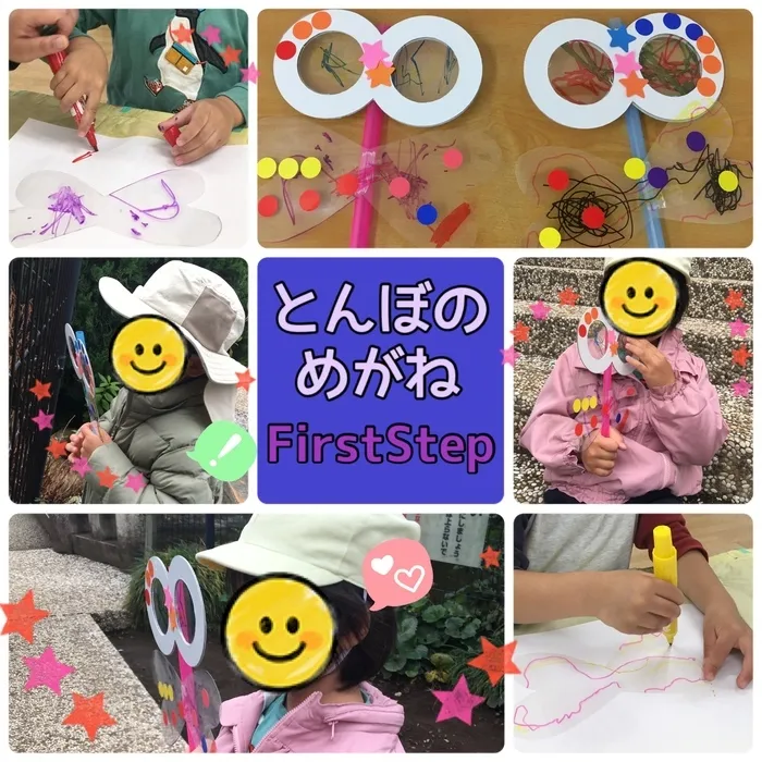 透明なシートに油性ペンでお絵描きをしてもらい、丸くくり抜いた厚紙に貼り付けたら自分だけのオリジナルのとんぼのめがねの完成です。