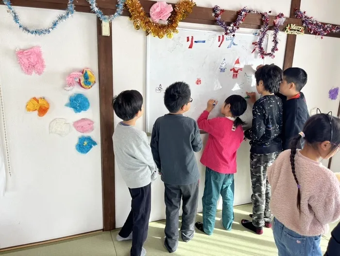 キラキラしたリースを貼ったり、サンタやトナカイ🦌の絵を描いたりと、