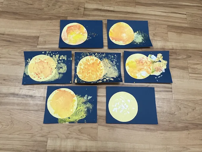 黄色・オレンジ・白の3色を単色絵の具で遊んでいくうちに色が混ざる事に気付いてくれ、すてきな色を作ってくれました!