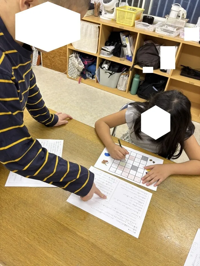 今回は少し漢字を入れた問題を準備しました。子どもたちは「これじゃない?」「ここに入るよ!」と指差したり声をかけ合ったりしながら、とても楽しそうに挑戦していました。難しい問題も、みんなで考えることで自然と協力が生まれ、コミュニケーションを深めるきっかけにもなっていました。