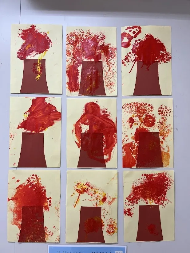 色を混ぜたりスタンプを押したりして、あたたかい色味の作品が完成です。