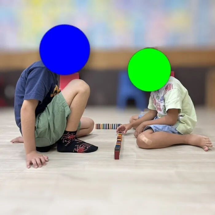 並べていて倒してしまった時に「ごめんね」、「いいよ」などの掛け合いがありコミュニケーションを取りながら協力して並べていました。