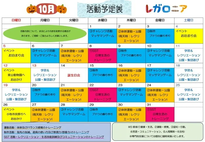いよいよ秋本番!ということで、今月はお泊まり会などの楽しいイベントはもちろん、公園での活動を中心に身体をめいっぱい動かす活動を予定しています💪