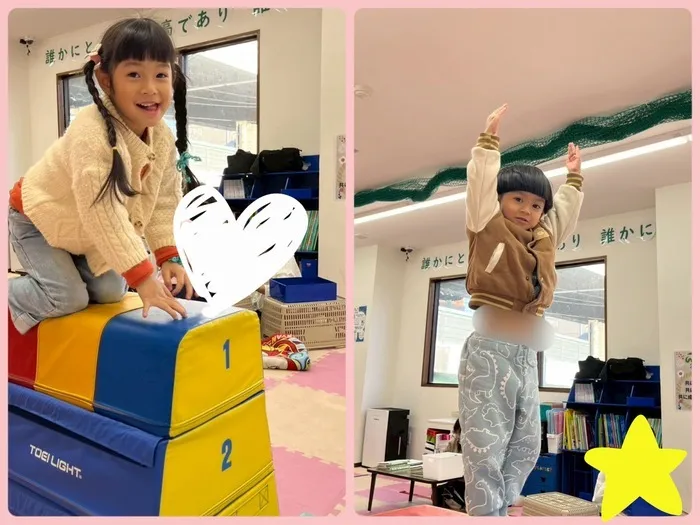 上手に跳んだり、跳び箱の上でポーズを決めて高く跳んだり、様々な遊び方をします😆