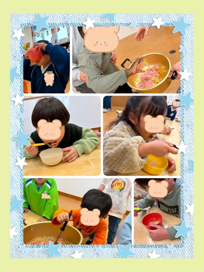「美味しい〜、もっと食べれる?おかわり下さい」と声が聞こえます。ほとんどの子がおかわりをして、みんな美味しく頂く事が出来ました。お家でも、簡単な料理など一緒に作り、作って食べると言う、達成感を楽しんで頂くのもいいですね~😊