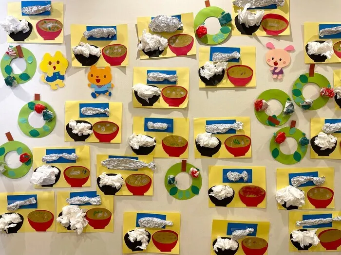 りんごは、おりがみをくしゃっとまるめてラップでくるみました。くしゃっとまるめるのもけっこう難しいものです。おのおのりんごと葉っぱを好きなところに貼り付けていました。サンマは、まるめた半紙をアルミホイルで巻き、形を整えて作りました。お味噌汁の具も、お豆腐、ネギ、わかめ、なめこ・・・みんなおうちのご飯を思い出して描いているのかなとほほえましく、「りんごの木」も「サンマ定食」も、個性あふれる楽しい作品となりました。