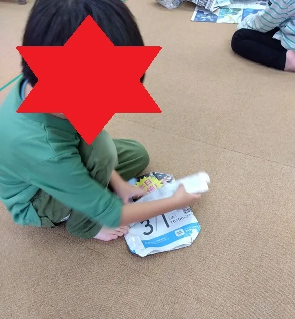 新聞紙遊びでは、新聞紙を破いたり、丸めて投げたり色んな遊び方がありますが、年齢が高い子になると自分でイメージしたものを作ろうとします🤔