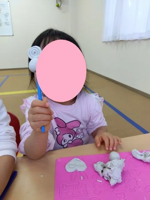 他にも、細長く伸ばした粘土を道具を使って細かく切ったり、穴を開けたりと形の変化を楽しむお子さんもいますよ!