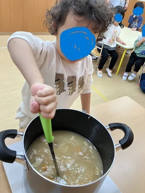 おたまをまわすところは、すっかりお母さん気分です。