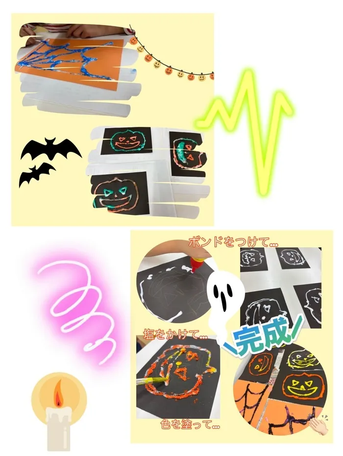 ジャックオーランタンや蜘蛛の巣が描かれているイラストの上をボンドでなぞり、塩を振りまいたあと、綿棒や筆に絵の具を染み込ませて着色していく活動でした🖌