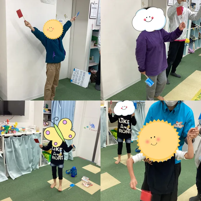 「赤あげて!」「青下げて!」といった指示に合わせて旗を動かすゲームです。