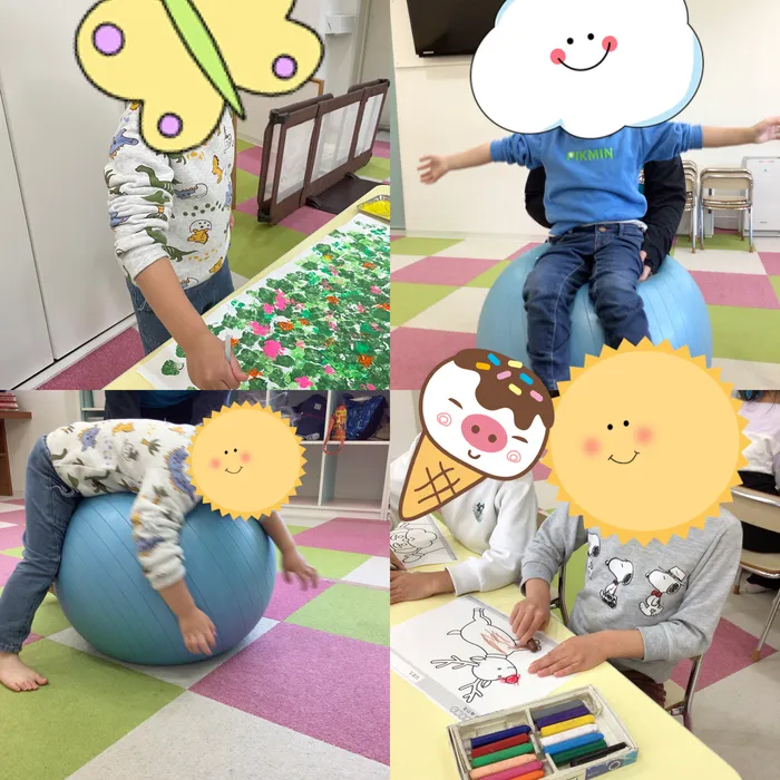 10秒間耐えるということで、上に座ったり、お腹や背中をつけながら、ゆらゆらと揺れるボールの上で先生に見守られながら頑張っていたお友だちでした☆