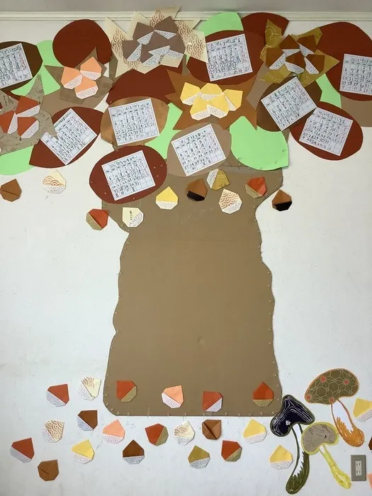 歌いながら くりの実を たくさん 折り紙で 折りました。