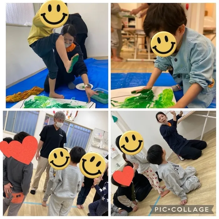 まずは手全体に絵の具をつけてツリーに色をぬりぬり🌱