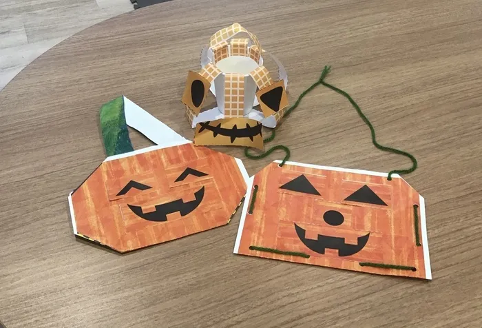 10月と言えば・・・ハロウィン!と言うことで、かぼちゃバッグを作りました🎃🎃お子さまの発達段階に応じて、ひもを通したり、顔のパーツをはさみで切ったり、立体物を作ったり、と工作の工程も少しずつ変わっています。
