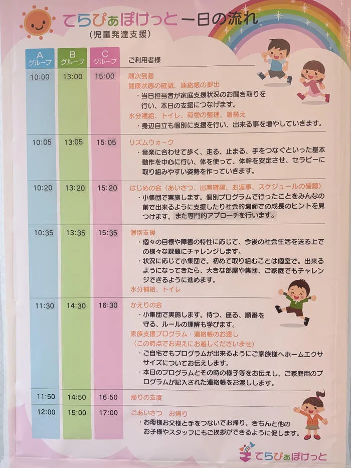 まず、てらぴぁぽけっとにはAクール、Bクール、Cクールの3つの時間帯があります。