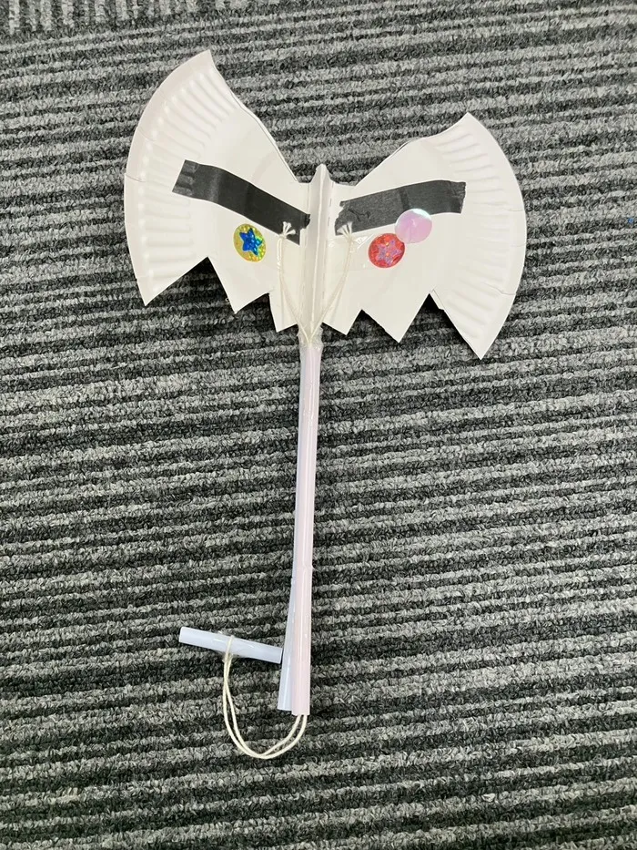 今日はハロウィンにちなんだ工作で、紐を引くと羽がパタパタ動く「コウモリステッキ」を作りました!