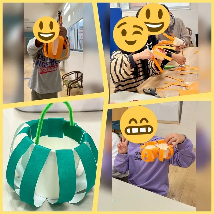 自分の好きな色のかぼちゃを作ったり、たくさんお菓子が入るように紙コップを2つ使ったりと、思い思いのお菓子入れができました!