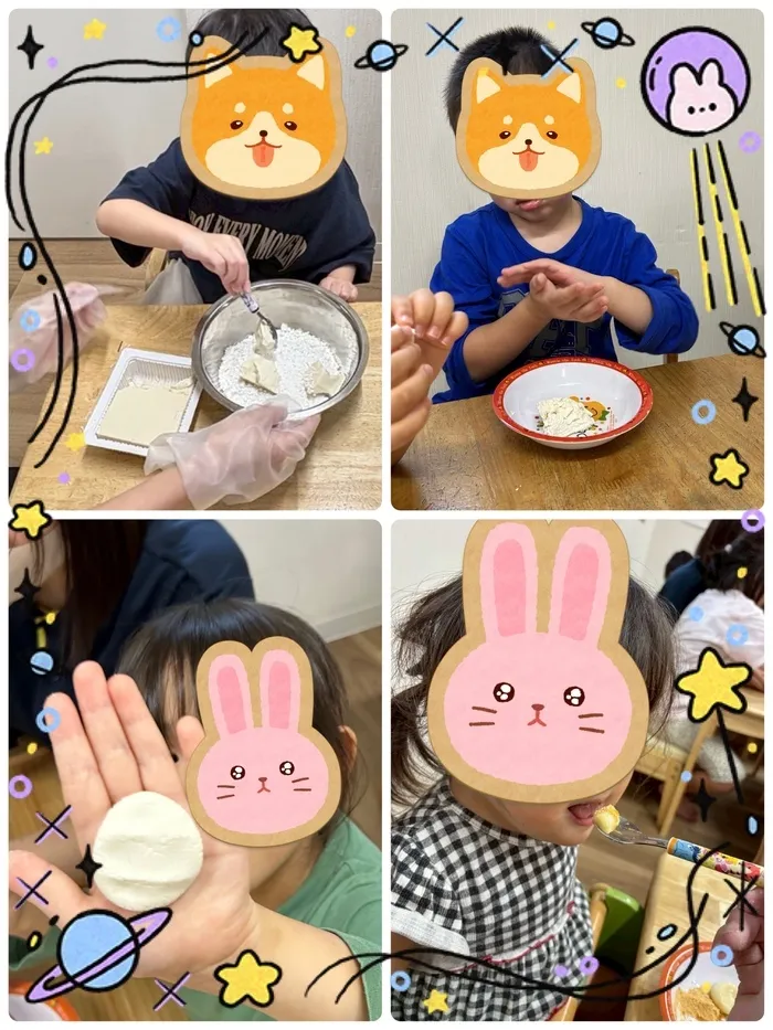 手のひらでコロコロ転がして丸くしたり、細長い“へびさん”の形や、ぺったんこの形にしてみたりと、それぞれ工夫しながら楽しんでいました🐍🍡
