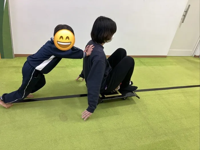 台車は、これまで上に乗って進んだり、指導員やお友だちが乗って後ろ向きに引っぱったり、様々な運動を行ってきました。今回は指導員が乗り、お友だちが後ろから押すことにチャレンジしました。腰を低くして足を踏ん張り、一生懸命押していく姿を見て「頑張れ‼」と声援が送られます‼ 見事にゴールすると指導員と力強くハイタッチ‼ すがすがしい笑顔がたくさん見られました(*^^)v