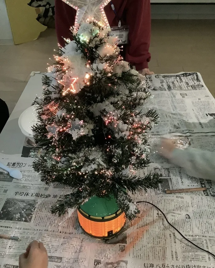 出来上がった雪は室内のミニクリスマスツリーにふりかけ、装飾をしました。
