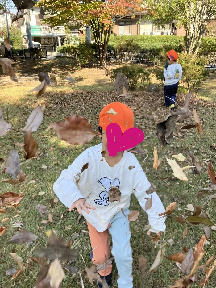 両手いっぱいに落ち葉を抱え、「いくよー」と嬉しそうに上に舞わせました!