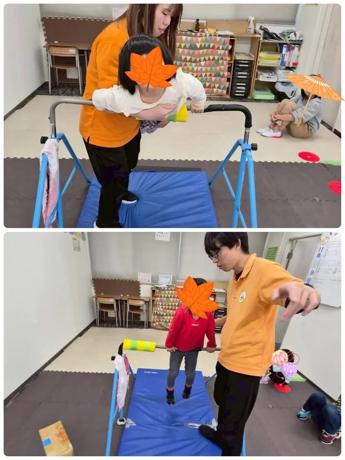 2台の鉄棒をフルに使い時間の許す限り練習しています!体が大きく成長してきている為に足抜き尻抜きで少し苦戦するお友だちもいますが、頑張っています!逆上がりにも皆んな果敢にチャレンジしています。補助ベルトやタオルを用いたり、肘を曲げる意識を強めるために鉄棒に鼻を近づけて体を浮かしたり、跳び箱を利用して懸垂を取り入れたり様々な工夫をしています✨