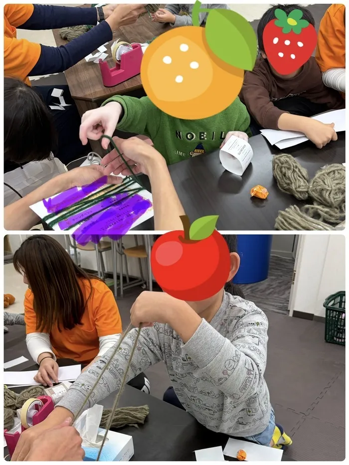 ベージュと緑の毛糸を用いて、まずは台紙にグルグルと数えながら巻きましたが、力加減が難しく台紙が曲がってしまう事も…少し解いて巻き直したりしながらもがんばりました。その後、ねじったり束ねたりもなかなか難しくねじった状態を保ち端と端を持ち苦戦しながらも交差させました!