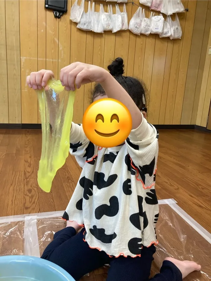 スライムの動きをじっと観察したり、好きな触り方を見つけたりする姿もあり、感触遊びを通して集中して取り組む時間が広がっています。