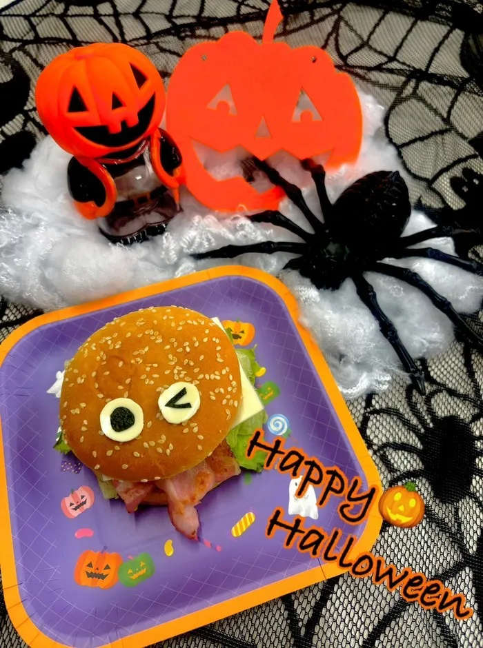 重ねたバンズの上にチーズと海苔で作った目をつけ、お化けの様な見た目にしています👻